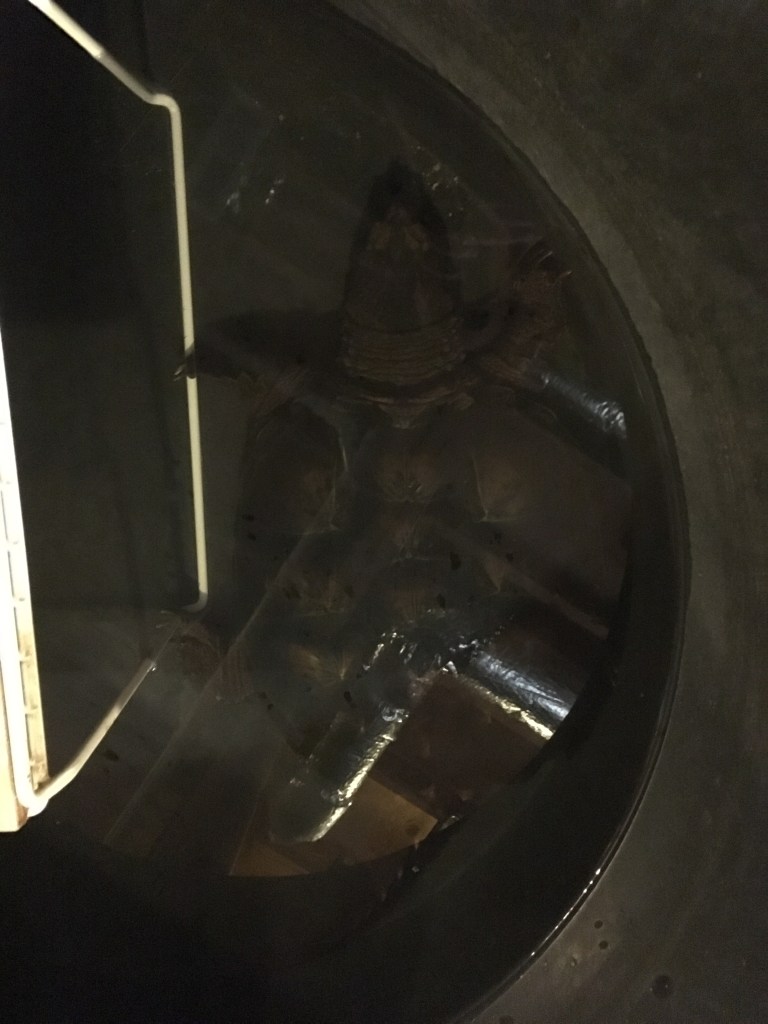 First up was feeding the snapping turtles with the broken jaws. There were a couple of them, and their lower jaws were both split down the middle, so they couldn’t bite. What this means is that we had to pry open their jaws and hold them open with wooden dowels, then use long metal tongs to shove raw fish down their gullets, and put them back in the water so that they could swallow it the rest of the way. Aquatic turtles need to be in water to swallow, something I did know from having them as pets, but I’ve never had to force-feed alligator snapping turtles before, so that was an experience! It took the two of us to wrangle them and keep the turtles still while feeding them. I learned that wrapping up feisty turtles in towels and placing them vertically in a milk crate with more towels wedging them into place is a good way to immobilize them. Not just from their limbs being pinned, but turtles have low circulation, so if you place them vertically instead of horizontally, their blood starts to pool at the bottom of their bodies away from their heads. It doesn’t hurt them, especially since it’s only done for a little while for treatment, but it makes them somewhat more dazed/lethargic/calm temporarily. As soon as they’re back in a horizontal position, they’re back to normal. I also learned today that snappers can go months without feeding if they have to.