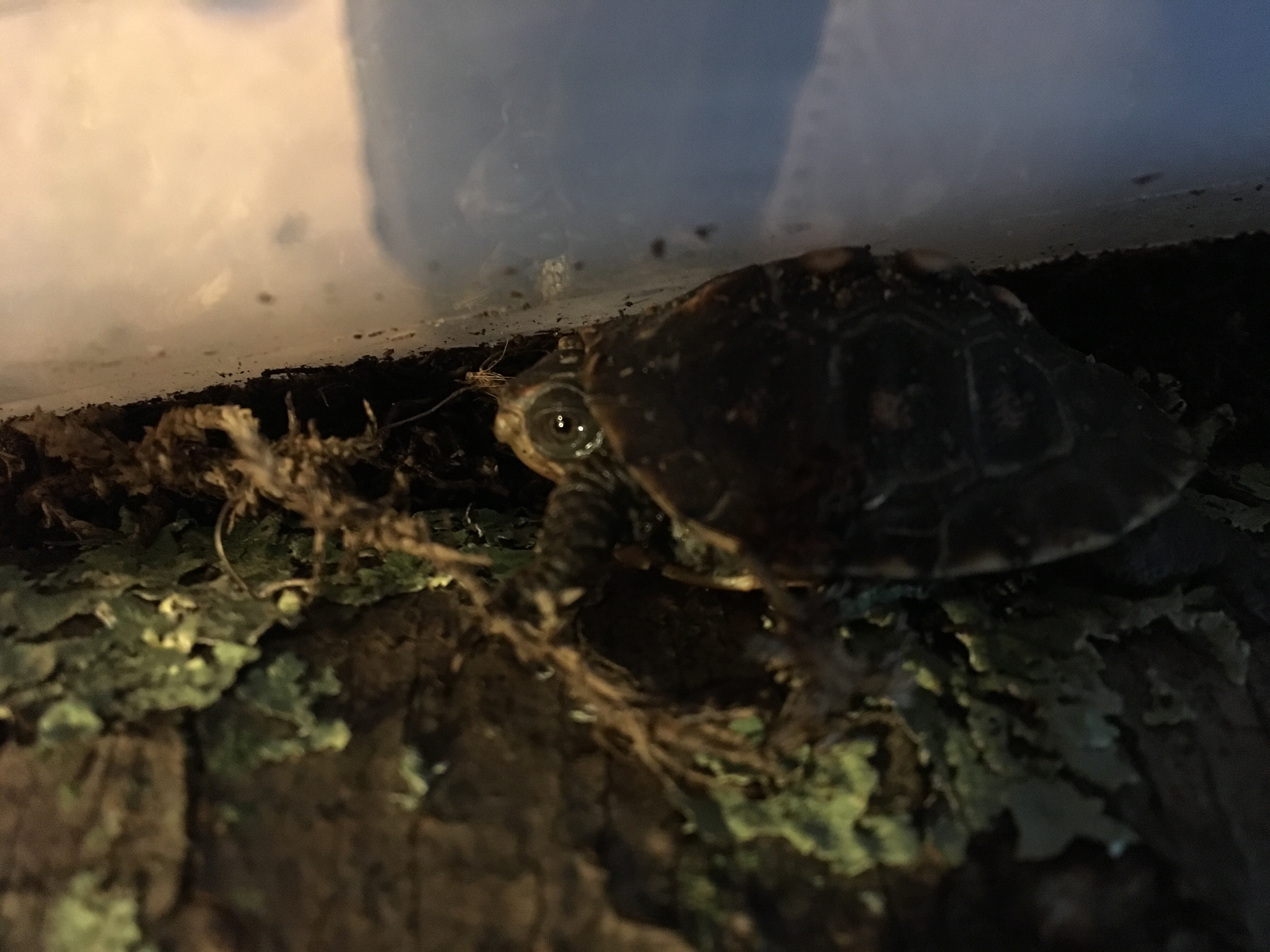 The other thing I did was change out the water bowl of hatchling box turtles. They just had a low, flat bowl filled with water. They need something to grab onto, though, when they’re that young, so there are peat moss strands in there, which I needed to try and keep in there while rinsing the bowl and giving them new water. They’re cute, though, so it’s worth it. These particular turtles were hatched from eggs that were salvaged from a gravid turtle that got hit by a car and didn’t make it. During the autopsy, Pam discovered a clutch of eggs and decided to try and save them. Miraculously, a few did survive, and if they grow up strong and healthy, despite their rocky start, they’ll be able to be released into the wild next year as juveniles or later as adults.