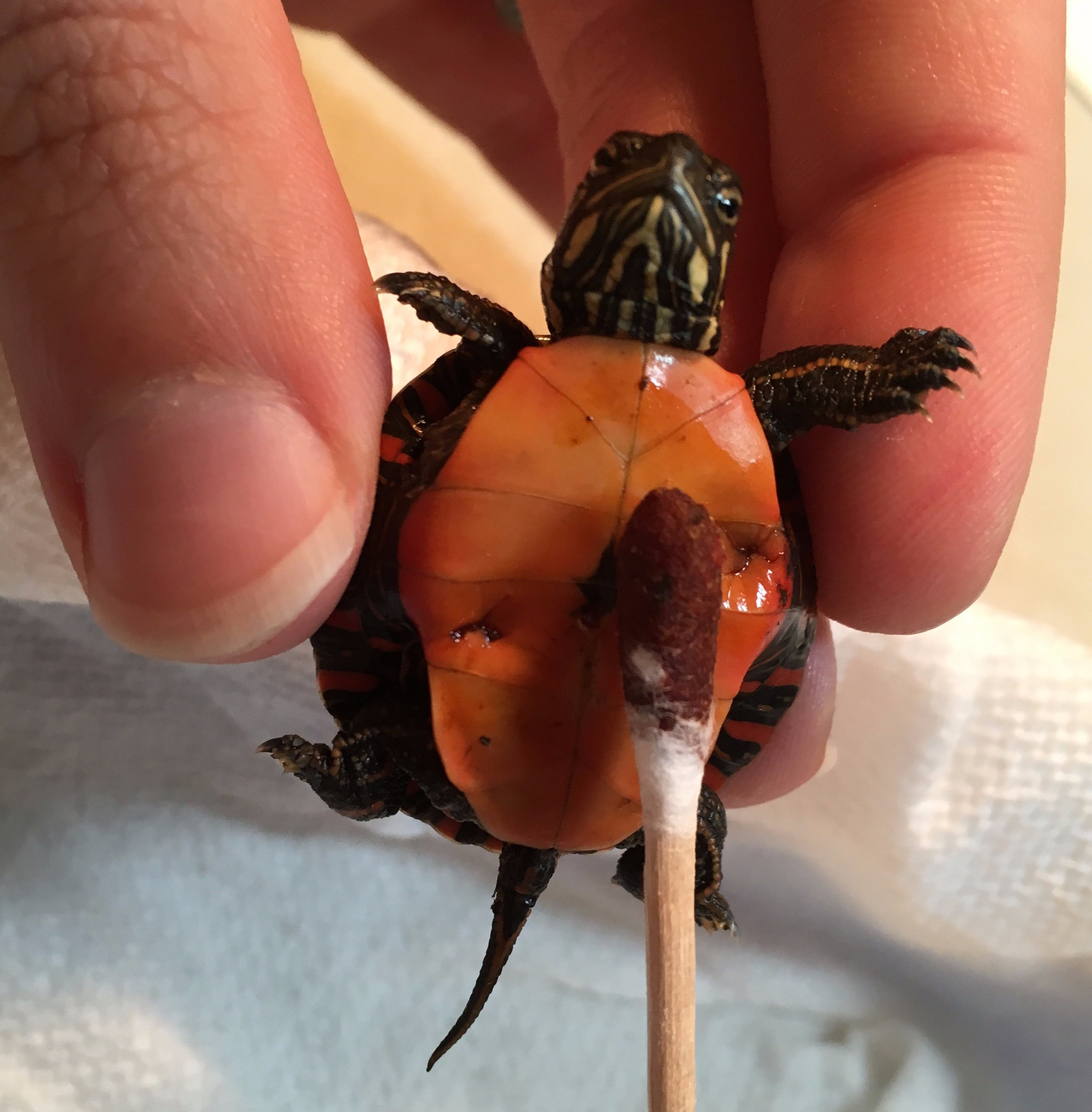 If you, personally, find an injured turtle, call a rehabber right away and get it into a clean, dry, cool, fly-proof container (rubbermaid bins, cardboard boxes, or pet carriers with an old sheet or towel over it are great). DO NOT TRY TO FEED IT (or give it water). Most turtles need to be underwater to swallow anyway, and they are likely in shock and can’t process food even if they were starving. If you try to force a turtle to drink, you may drown it by accidentally getting water in its lungs while it is in an already distressed state.