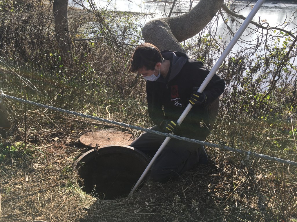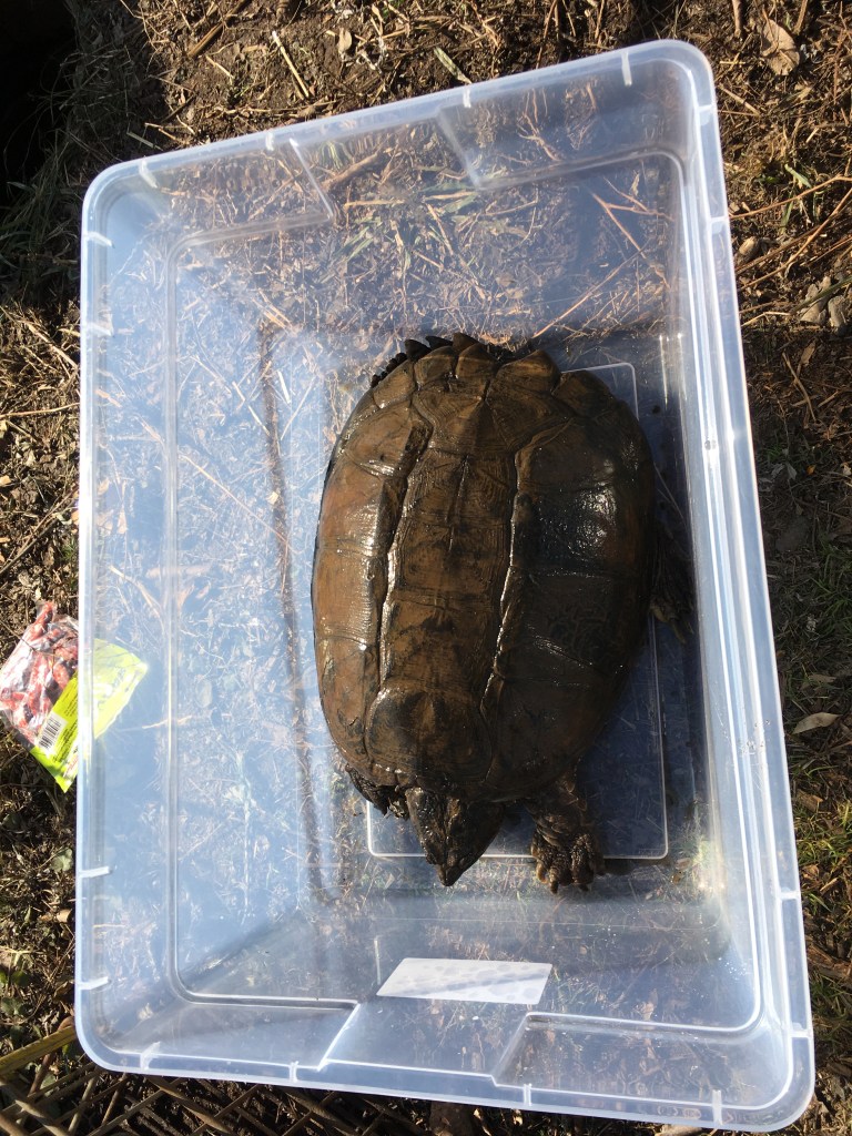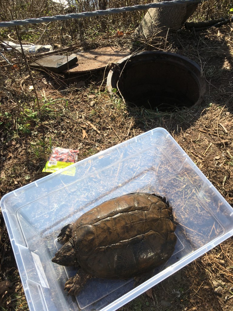 Another good thing was my husband coming along to do the dirty work. I wish I took pictures of my husband Bobby actually in the hole, but I was too busy handing him tools and taking up trash that was getting in the way (and playing PR manager to bystanders)…but Bobby spent about an hour and a half fishing around in this manhole (after trying from the top wasn’t working), balanced on tiny pieces of pipe, trying to rescue the snapping turtle that was stuck down there on a 25º cold November morning (who did NOT want to be caught). There was no way in or out except the vertical 10-foot drop with only some of the built-in ladder rungs not rusted off. He put his parkour and ninja skills to good use and rescued a ~20lb snapping turtle from certain death.