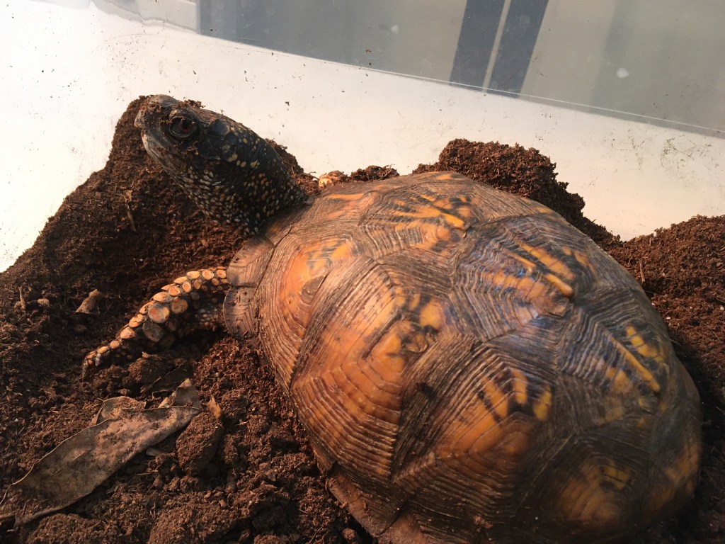 It may not look like much, but this represents so much progress for this little guy. When I first took in this eastern box turtle patient, back in July, I was pretty sure he wouldn’t survive the week, nevermind recover. He had been hit by a car right on the side of his head. His shell was undamaged, but his beak was cracked, his eye was clearly done for, he had such brain damage that he couldn’t hold his head up, he barely was able to move, and on top of all that, he had aspiration pneumonia. A well-intentioned but untrained finder who kept him for several days before calling for help tried to feed him a liquid formula for other animal species, which slid down into his lungs, making him deathly ill on top of his head trauma.
