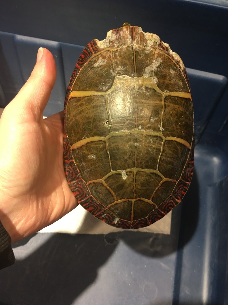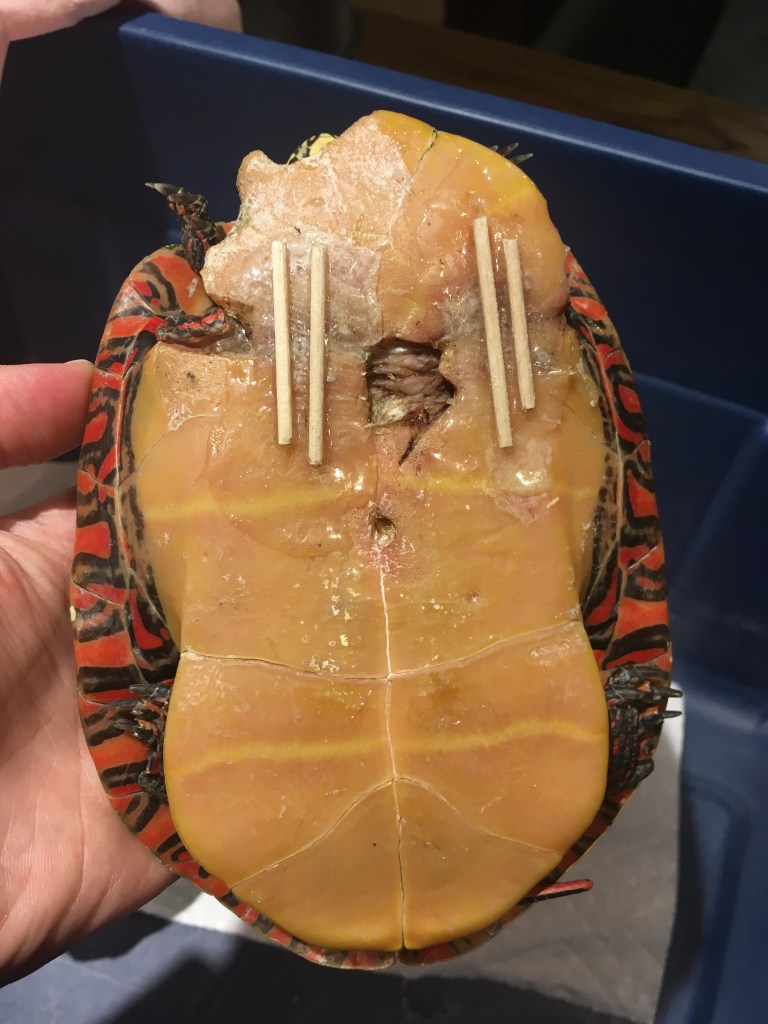 This turtle was found in a person’s backyard being chewed on by the owner’s dog in August. The person took one look at a bleeding turtle with a hole chewed through its shell and thought, “I’m just going to kidnap this animal and wing it.” They tried to keep this turtle as a pet and gave it no medical intervention whatsoever, and when they did have it in their house in some horrid little tank that probably wasn’t kept clean feeding it god knows what…surprise, surprise: she developed septicemia and necrosis of the skin and shell.